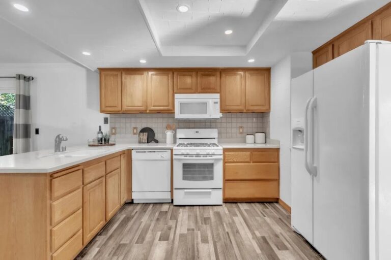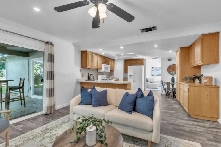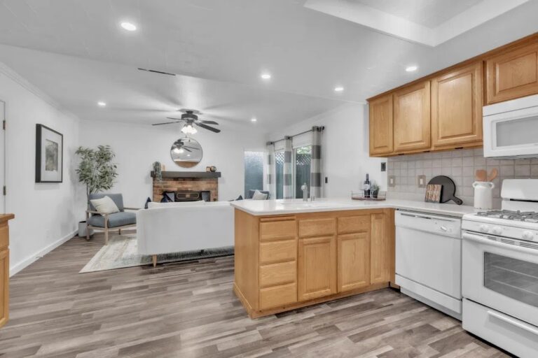 *Spacious Kitchen with Durable, Easy-to-Clean Corian countertops, classic oak cabinetry, and opens to a cozy family room area. *Recent upgrades include a newer roof, newer HVAC, dual-pane windows, and a comfortable attic fan that circulates air and helps maintain a cool, pleasant environment year-round.
